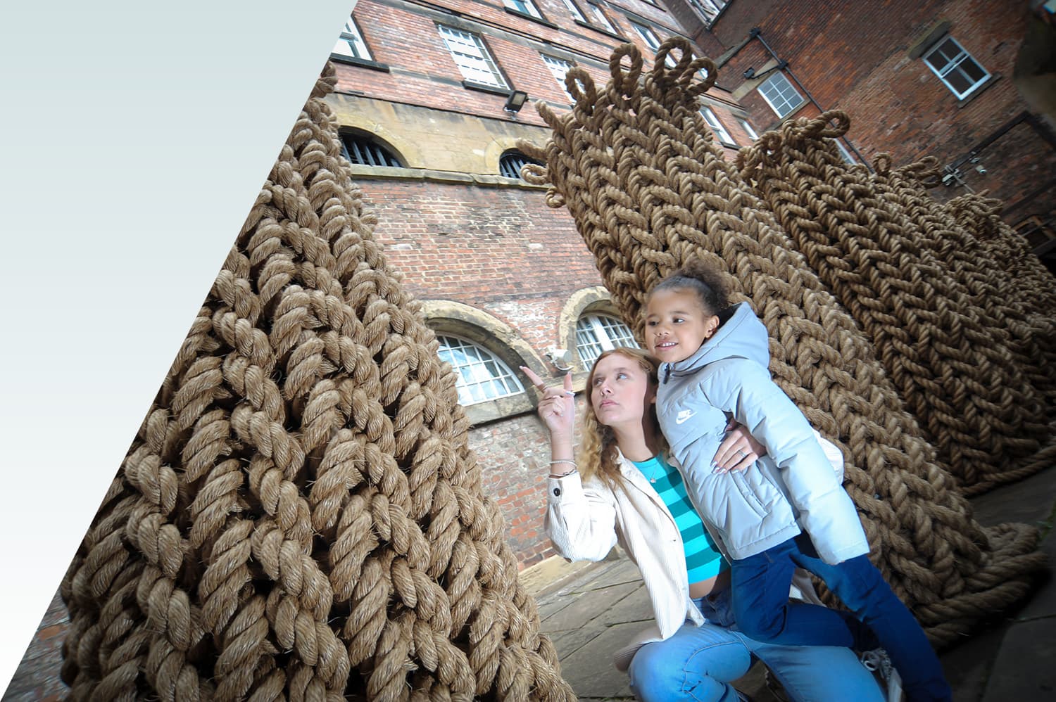 The knitting together of the rope and the way each pillar will sag and fray exposed to the elements, recognises how lives, families and communities are strongly woven together, yet can also be unravelled by circumstance.