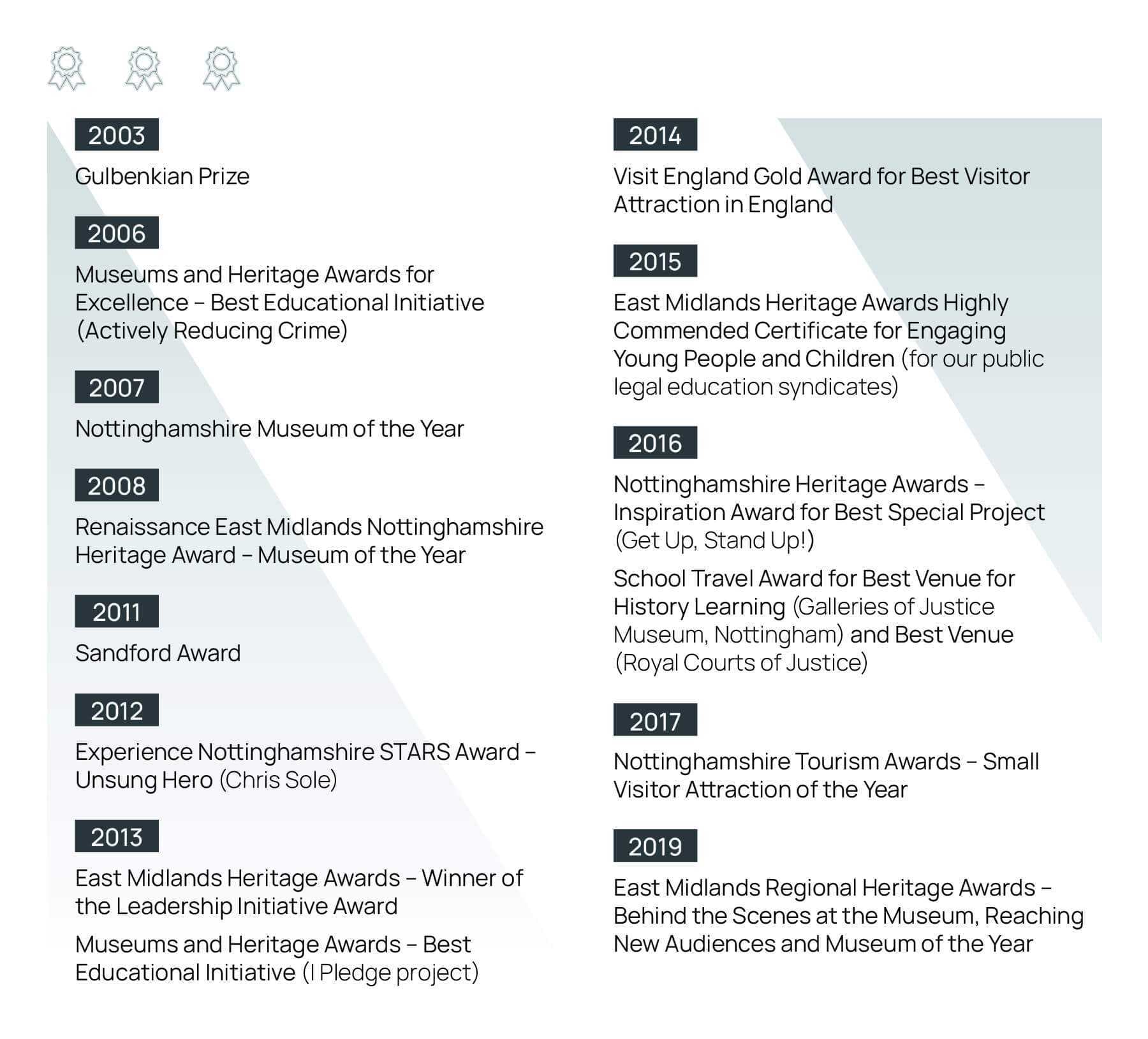 The National Justice Museum and its learning programmes have received national and international recognition since 1995, earning many top awards: from the Gulbenkian Prize for inspirational work in 2003, to a Visit England Gold Award for Best Visitor Attraction in 2014, and East Midlands Region Museums Award for Best Museum in 2019